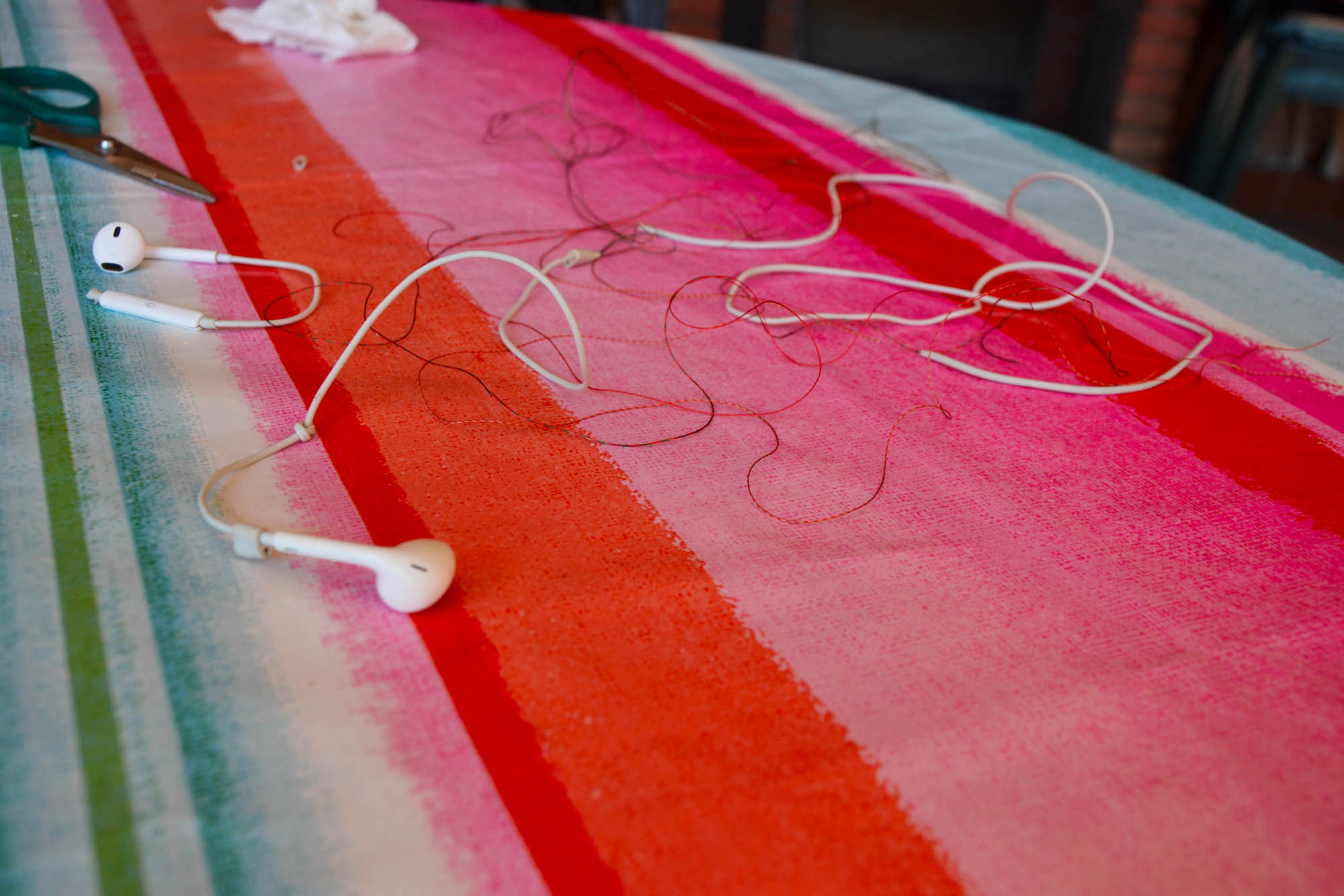 Terracotta powder obtained through grinding the ceramic of the old pot was implemented whiting the new clay used to make the sculptures; the powder decorates and leaves a trace of the past material identity on the new objects with a series of peculiar red shades. The ash of the fir wood was used as a component for the glaze – this, burned away by the kiln’s heat, leaves on the surface of the sculptures a trace of the wood’s presence through its absence: in the kiln, the ash mixed with the transparent glaze produces a superficial aesthetic that through material subtraction by fire leaves on the object evocative drops of glaze. Ear pods, glasses, and mask were employed as mechanical tools during the making process, implemented in the sculpture as structural elements and narrative aesthetic features.